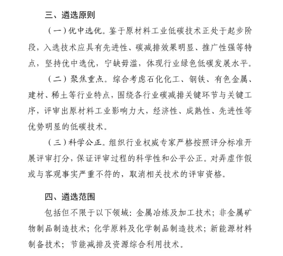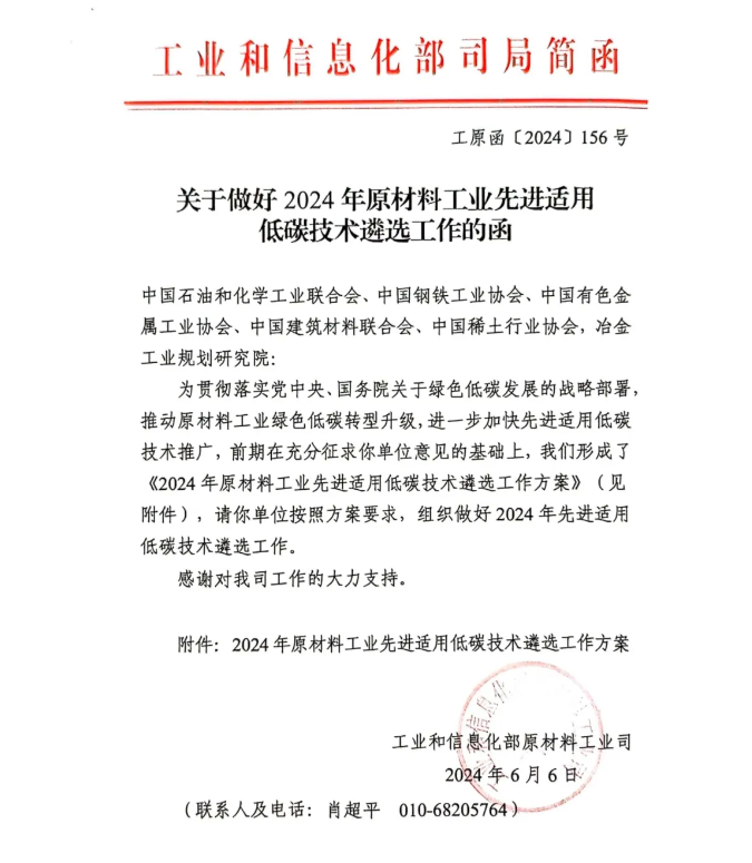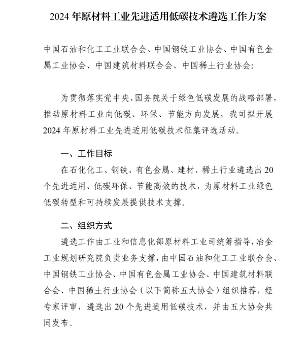 為貫徹落實黨中央、國務院關于綠色低碳發展的戰略部署,推動原材料工業綠色低碳轉型升級,進一步加快先進適用低碳技術推廣,工業和信息化部原材料工業司形成《2024年原材料工業先進適用低碳技術遴選工作方案》,正組織開展2024年原材料工業先進適用低碳技術遴選工作,將在石化化工、鋼鐵、有色金屬、建材、稀土行業遴選出20個先進適用、低碳環保、節能高效的技術,為原材料工業綠色低碳轉型和可持續發展提供技術支撐。