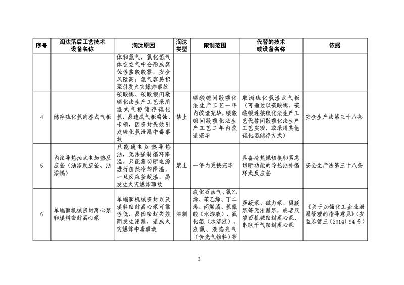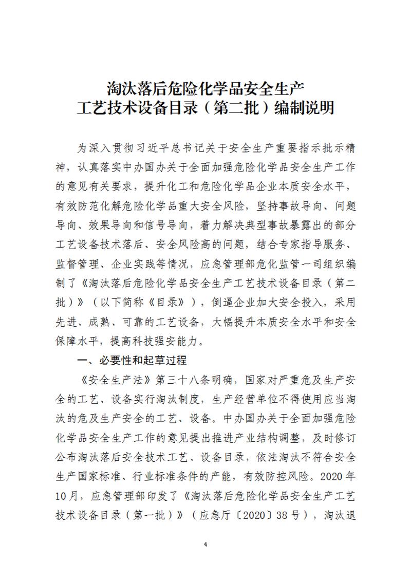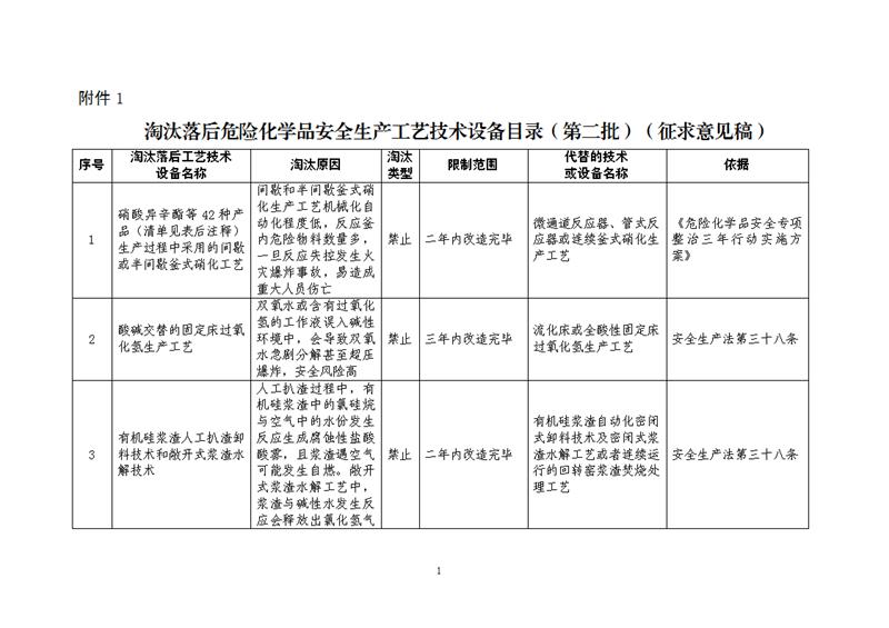 為認(rèn)真落實(shí)中共中央辦公廳、國務(wù)院辦公廳《關(guān)于全面加強(qiáng)危險化學(xué)品安全生產(chǎn)工作的意見》有關(guān)要求,提升化工和危險化學(xué)品企業(yè)本質(zhì)安全水平,有效防范化解危險化學(xué)品重大安全風(fēng)險,應(yīng)急管理部危化監(jiān)管一司組織制定了《淘汰落后危險化學(xué)品安全生產(chǎn)工藝技術(shù)設(shè)備目錄(第二批)》(征求意見稿)和編制說明(見附件1)。